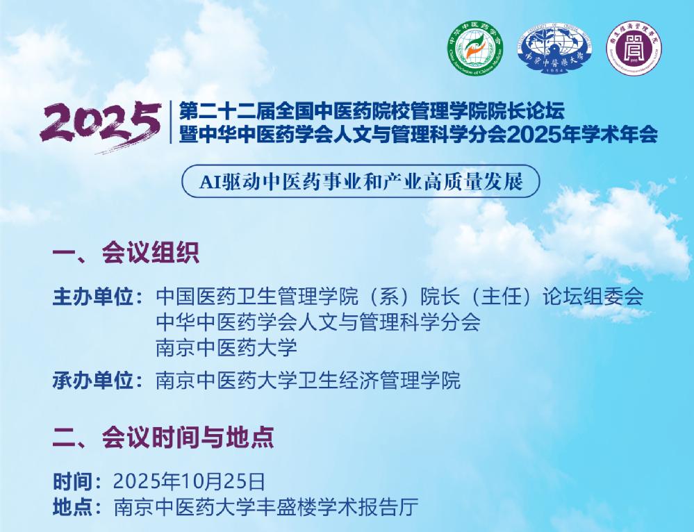 关于召开第二十二届全国中医药院校管理学院院长论坛暨中华中医药学会人文与管理科学分会2025年学术年会的通知