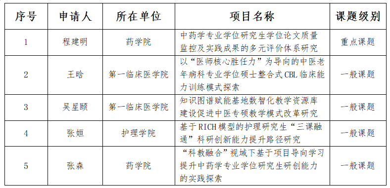 日前,中国学位与研究生教育学会中医、中药学专业学位委员会、全国中医药高等教育学会研究生教育研究会公布了2024年全国中医药研究生教育研究课题立项名单,我校共有5项课题获得立项,其中重点课题 1 项,一般课题 4 项。