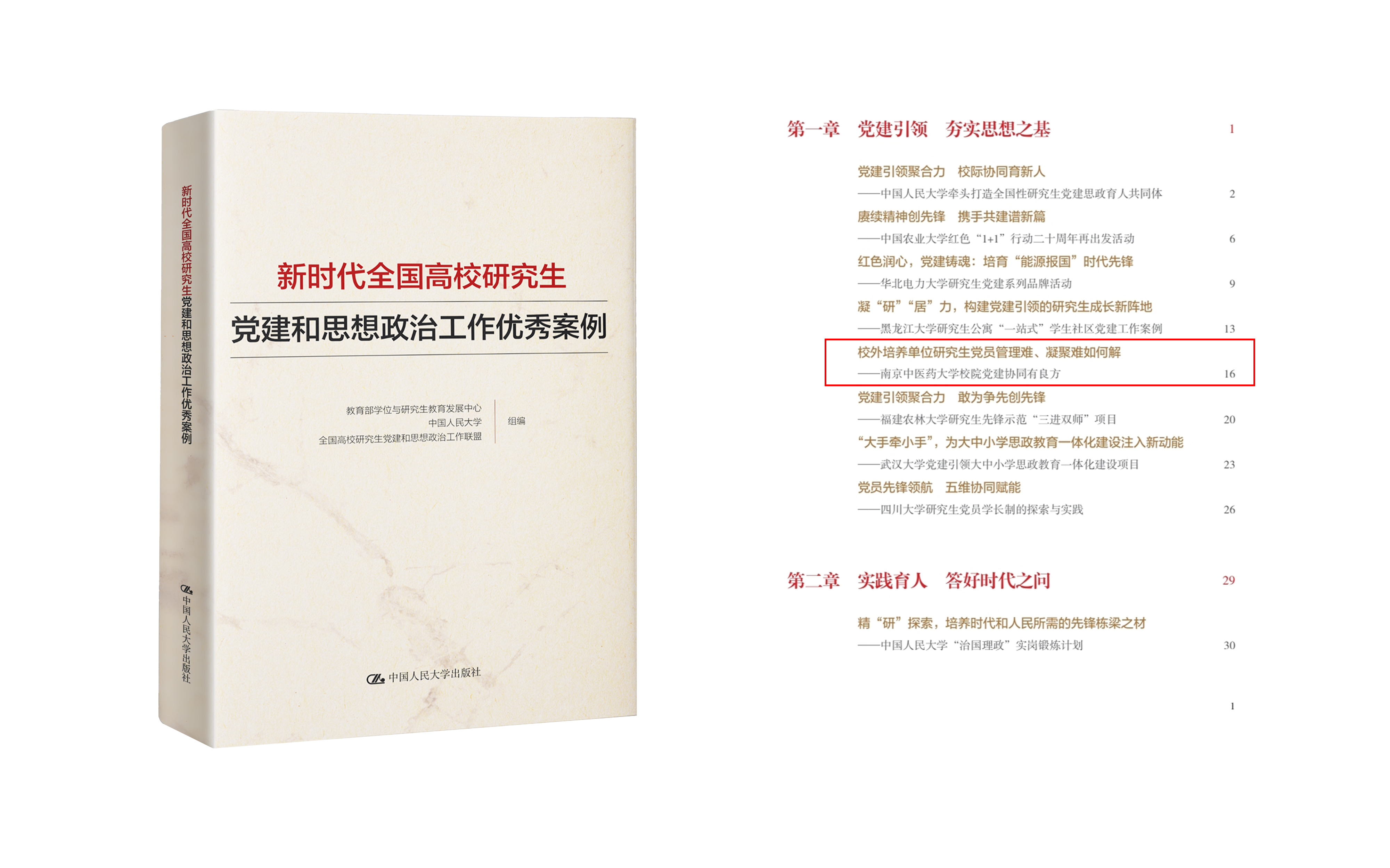 近日,新时代全国高校研究生党建和思想政治工作研讨会(2025)在中国人民大学举行。会上发布了由教育部学位与研究生教育发展中心指导,中国人民大学、全国高校研究生党建和思想政治工作联盟组编的《新时代全国高校研究生党建和思想政治工作优秀案例》。我校案例《校外培养单位研究生党员管理难、凝聚难如何解——南京中医药大学校院党建协同有良方》入选。